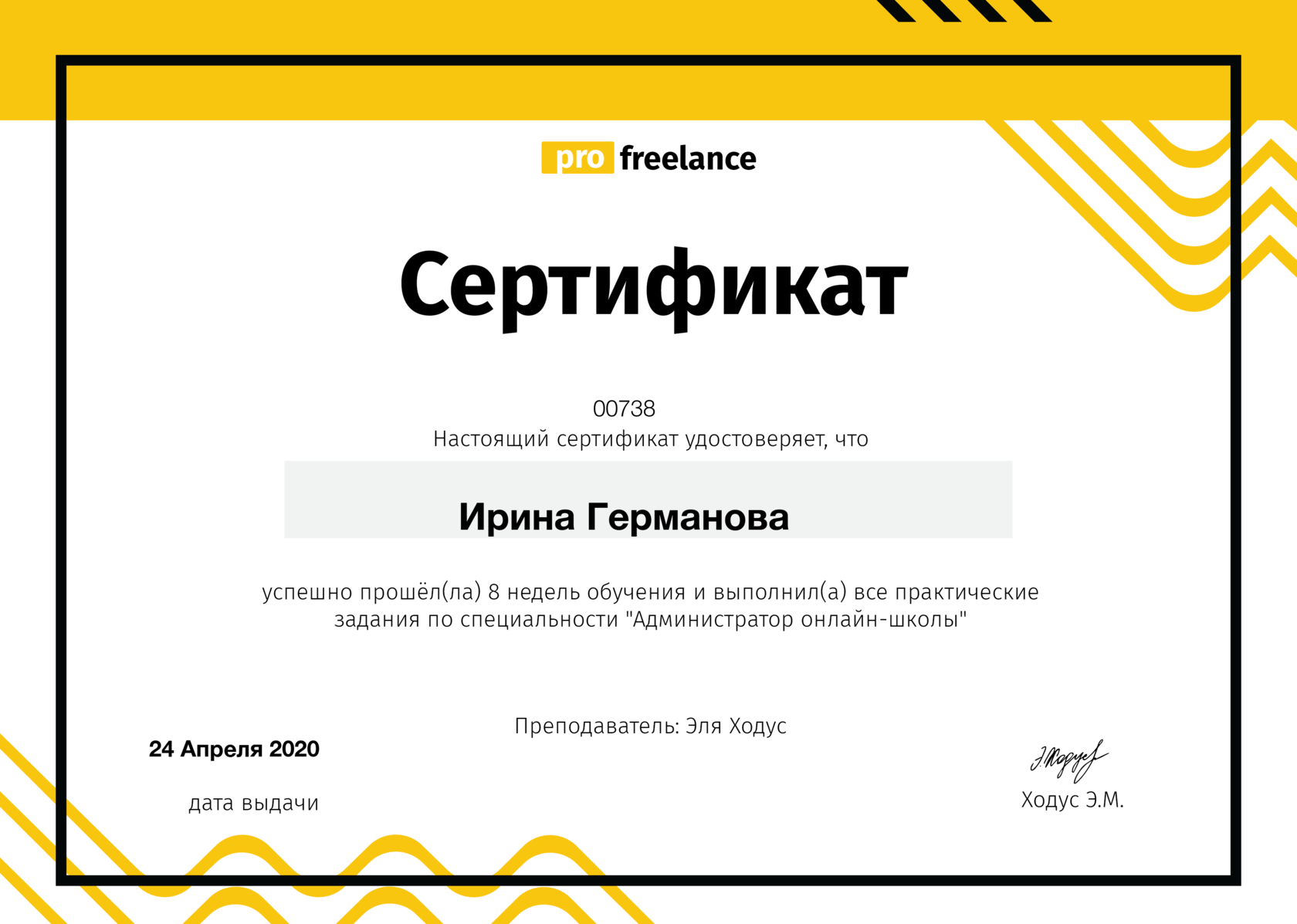 Меня зовут Ирина Германова, я прошла обучение в онлайн школе ProFreelance у Эли Ходус на курсе "Администратор онлайн-школ".